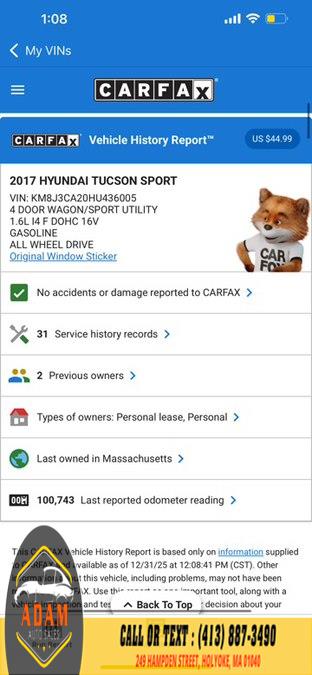 2017 Hyundai Tucson Sport AWD, available for sale in Holyoke, Massachusetts | Adam Auto Sales. Holyoke, Massachusetts